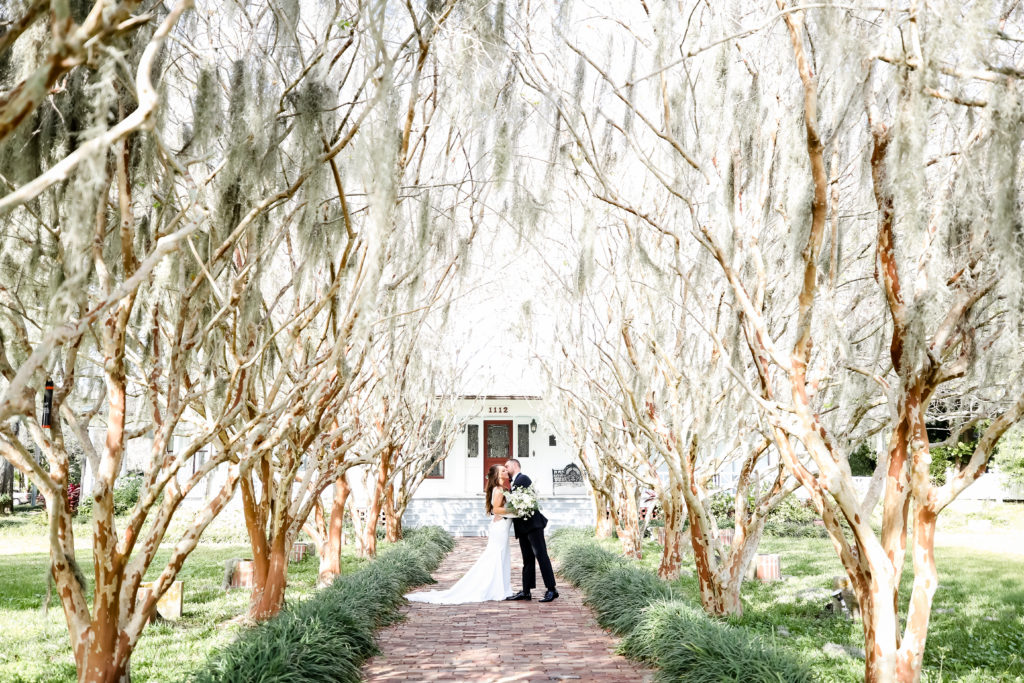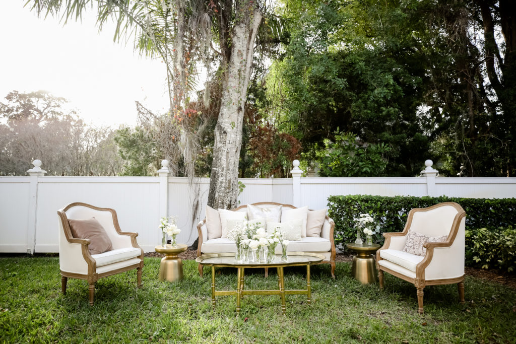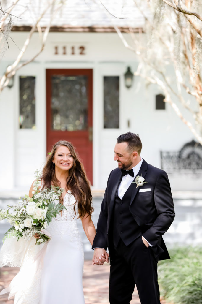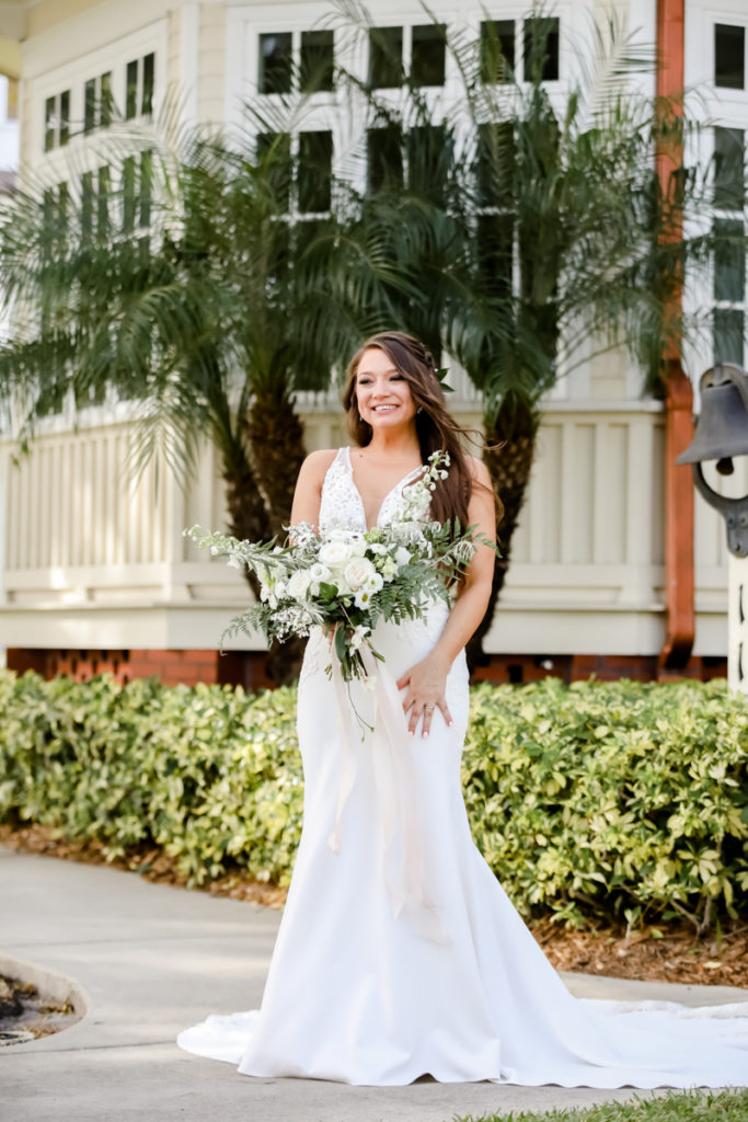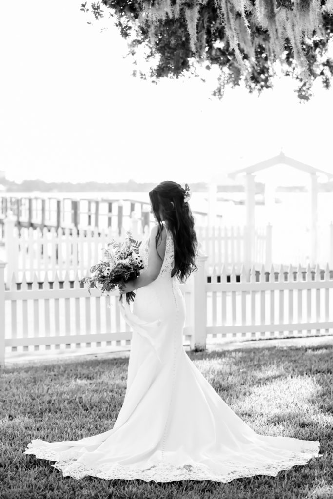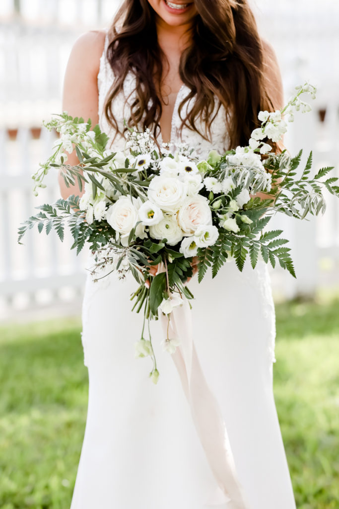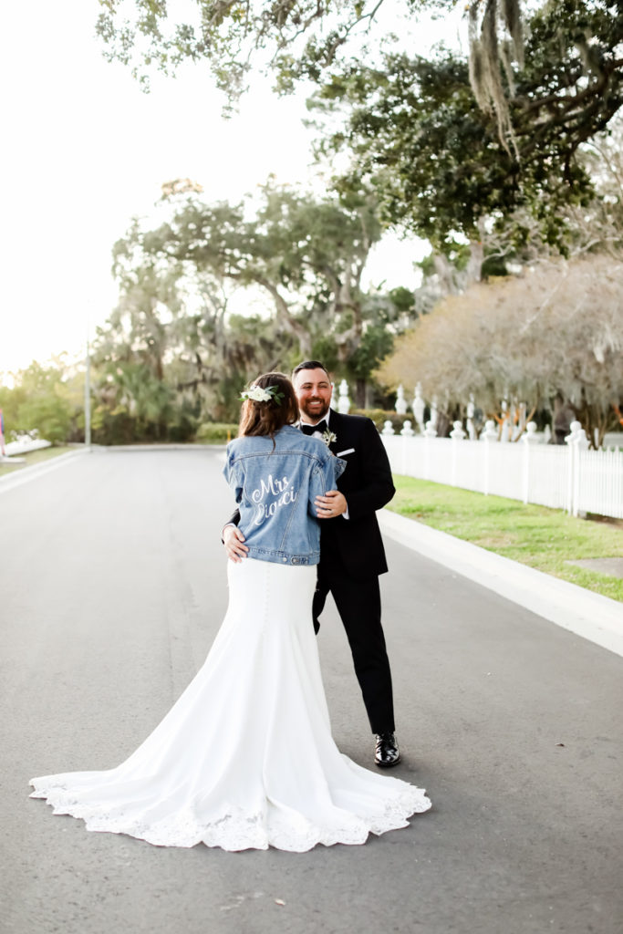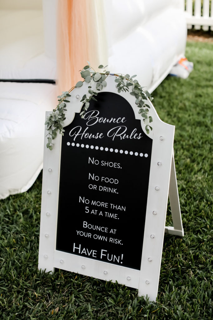 While we find it so exciting to shoot at the biggest, most ‘popping’ venues in Florida, sometimes shooting in an uncommon location can be so inspiring and an adventure! That is how we feel about Juli and Brett’s sweet backyard style wedding at the Palmetto Riverside Bed and Breakfast in Palmetto, FL. A color palette of various shades of white and greenery created a beautiful canvas for the breathtaking day. Their classic yet boho vibe flourished at this venue, and every detail was a representation of the couple’s fun and loving personalities. The bride showed off a custom jean jacket that added a cheerful, personal touch to her bridal attire. Also… a wedding BOUNCEHOUSE?! Yeah, we were pretty stoked about it too…