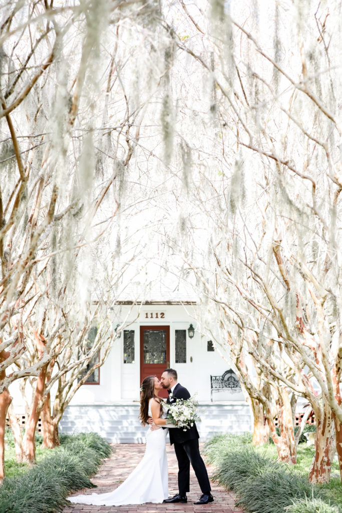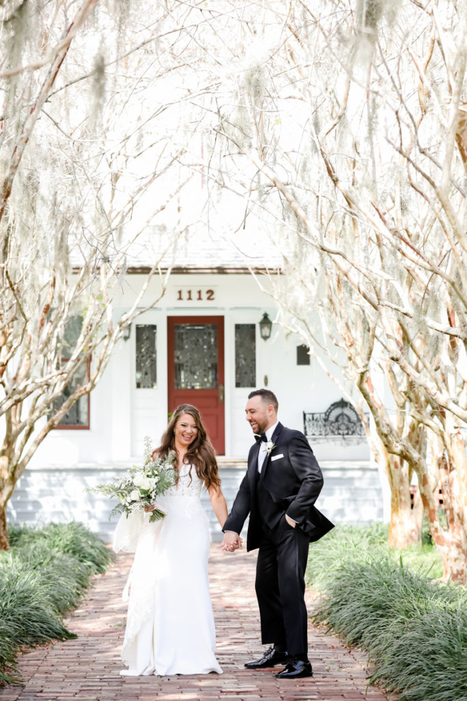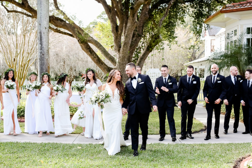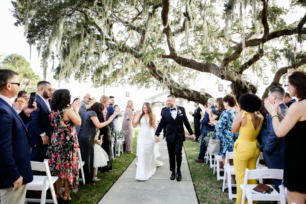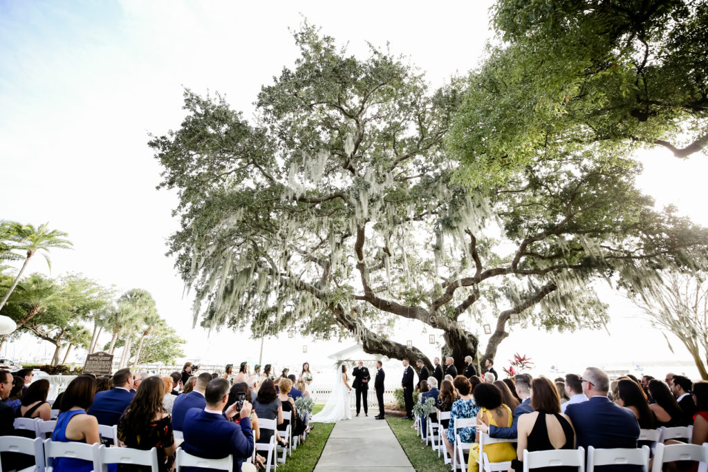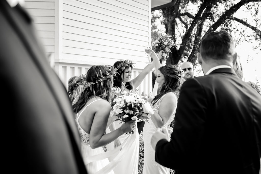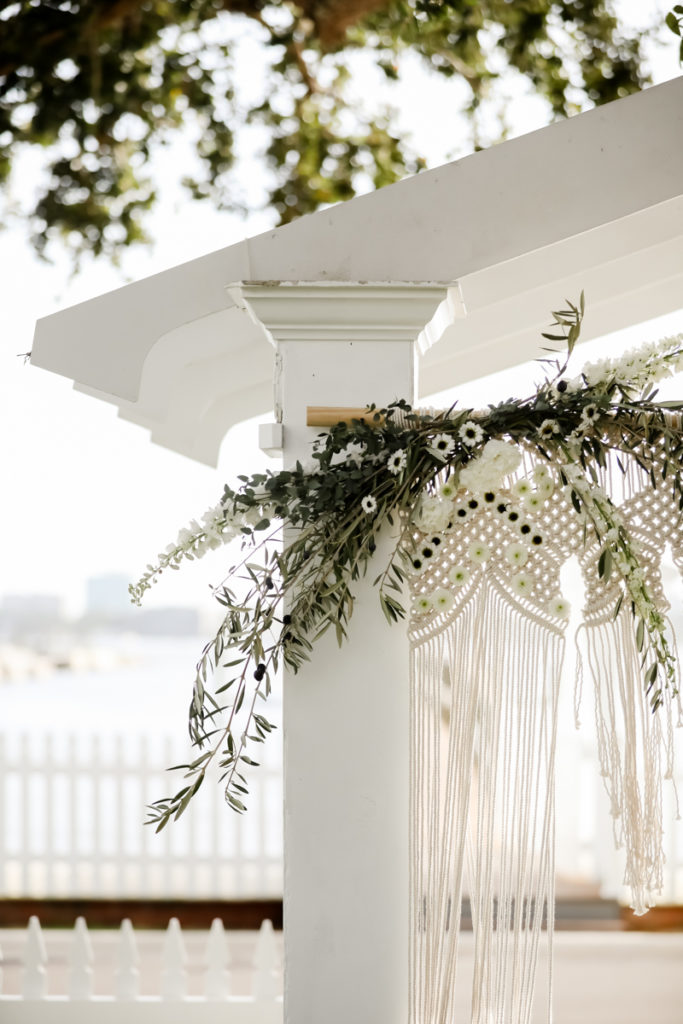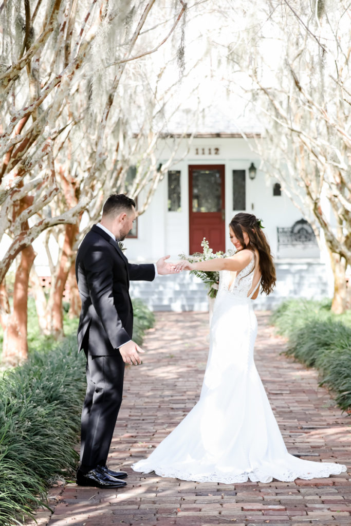 While we find it so exciting to shoot at the biggest, most ‘popping’ venues in Florida, sometimes shooting in an uncommon location can be so inspiring and an adventure! That is how we feel about Juli and Brett’s sweet backyard style wedding at the Palmetto Riverside Bed and Breakfast in Palmetto, FL. A color palette of various shades of white and greenery created a beautiful canvas for the breathtaking day. Their classic yet boho vibe flourished at this venue, and every detail was a representation of the couple’s fun and loving personalities. The bride showed off a custom jean jacket that added a cheerful, personal touch to her bridal attire. Also… a wedding BOUNCEHOUSE?! Yeah, we were pretty stoked about it too…