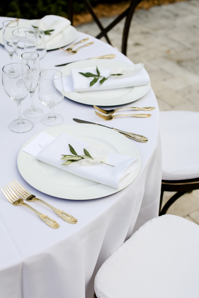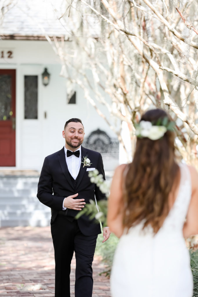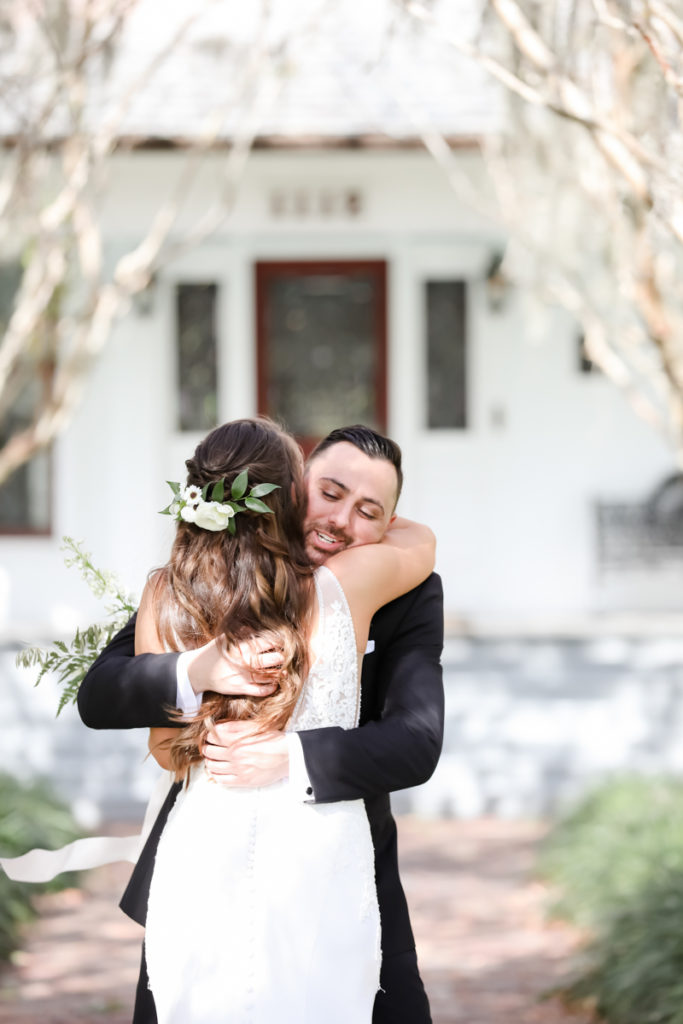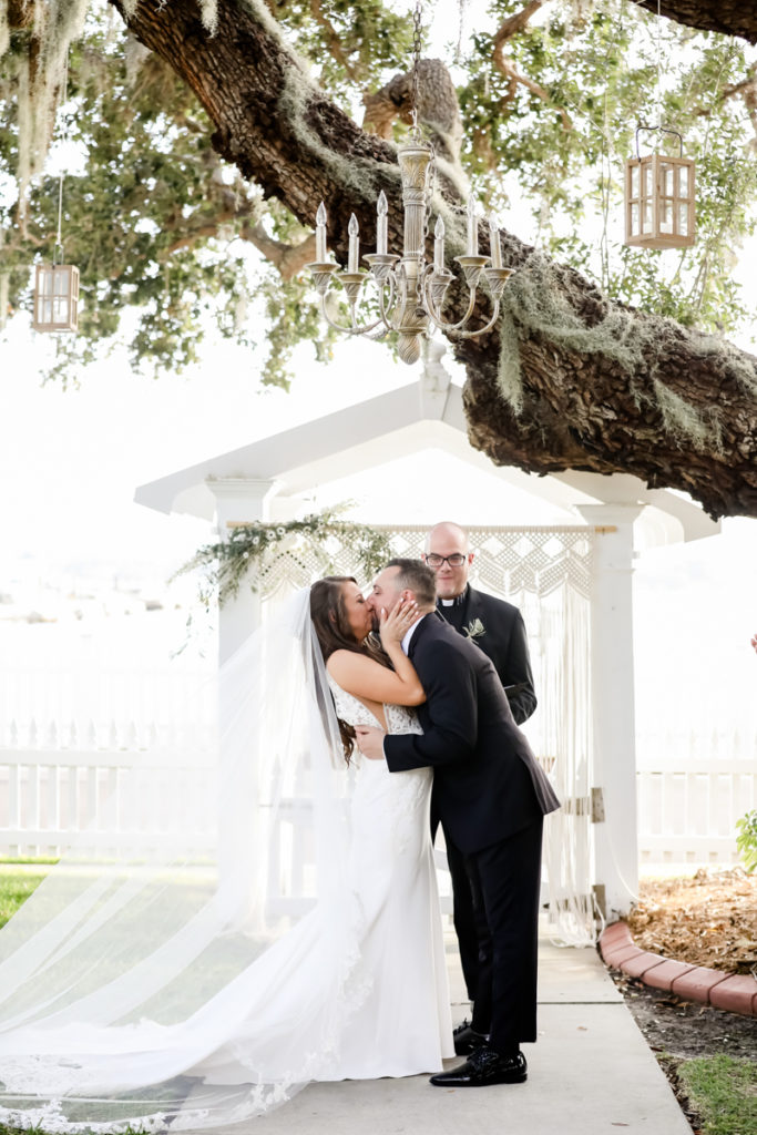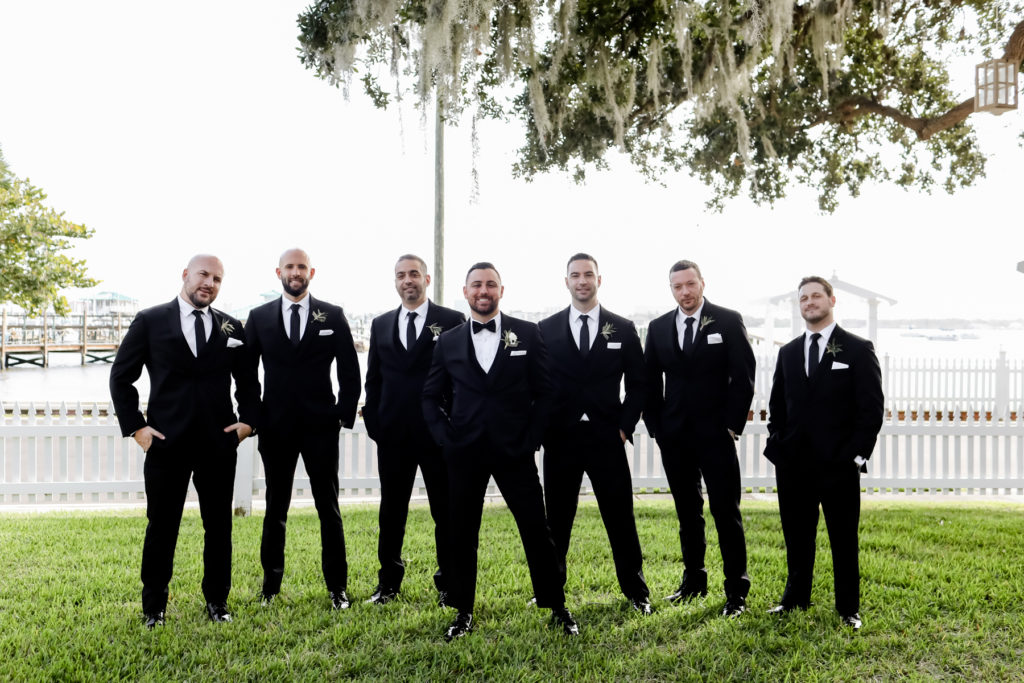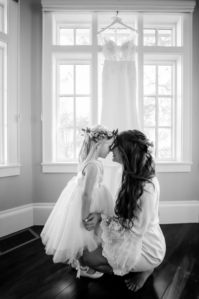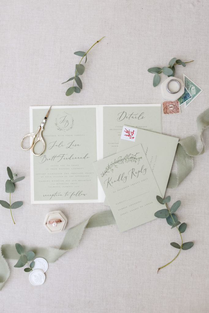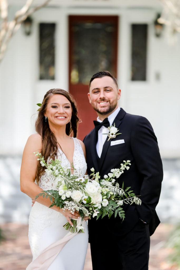 While we find it so exciting to shoot at the biggest, most ‘popping’ venues in Florida, sometimes shooting in an uncommon location can be so inspiring and an adventure! That is how we feel about Juli and Brett’s sweet backyard style wedding at the Palmetto Riverside Bed and Breakfast in Palmetto, FL. A color palette of various shades of white and greenery created a beautiful canvas for the breathtaking day. Their classic yet boho vibe flourished at this venue, and every detail was a representation of the couple’s fun and loving personalities. The bride showed off a custom jean jacket that added a cheerful, personal touch to her bridal attire. Also… a wedding BOUNCEHOUSE?! Yeah, we were pretty stoked about it too…