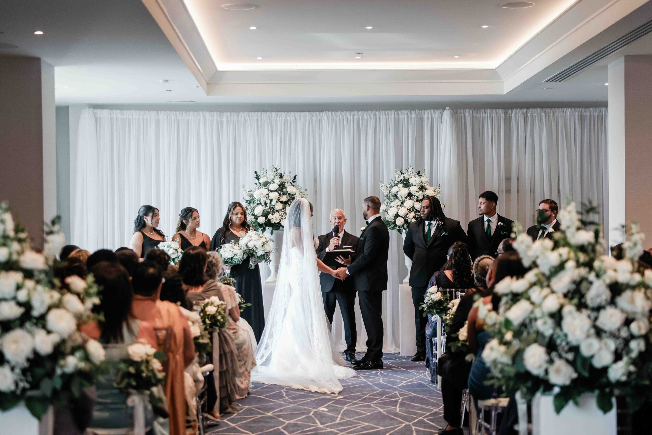 The ceremony took place indoors, where floor-to-ceiling windows framed the Tampa skyline and surrounding bay. Natural light poured into the space as the couple exchanged vows, creating a serene and sacred atmosphere. Being elevated above the city brought a quiet stillness to the moment — a feeling of being set apart, focused solely on the promises being made.
