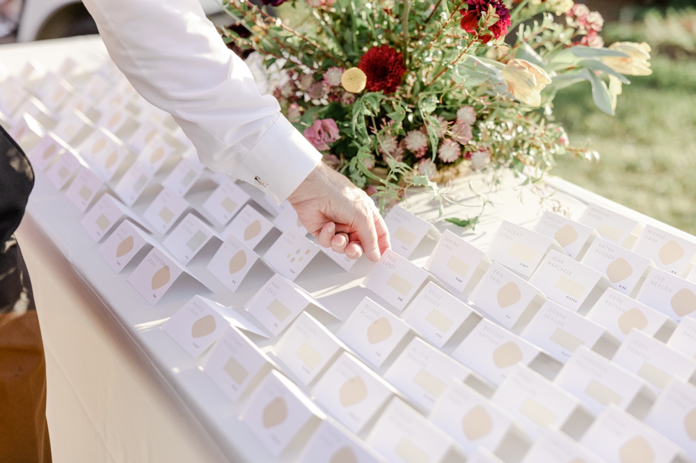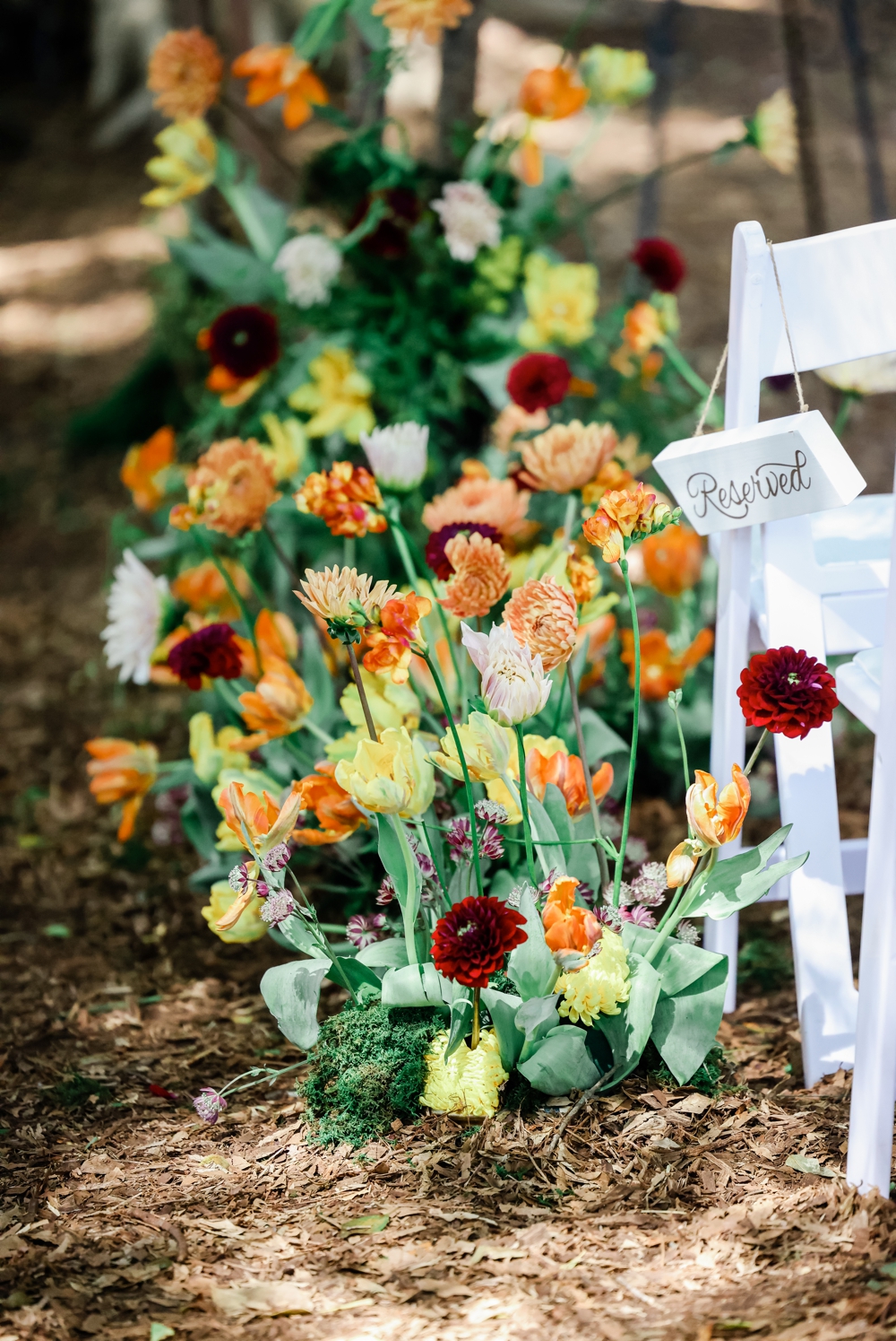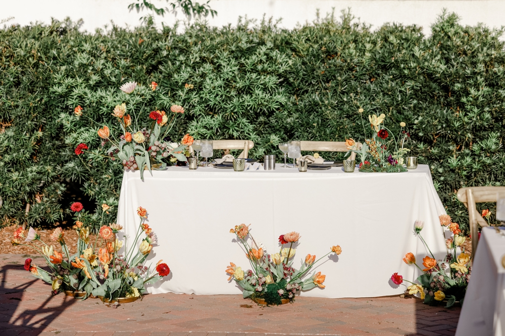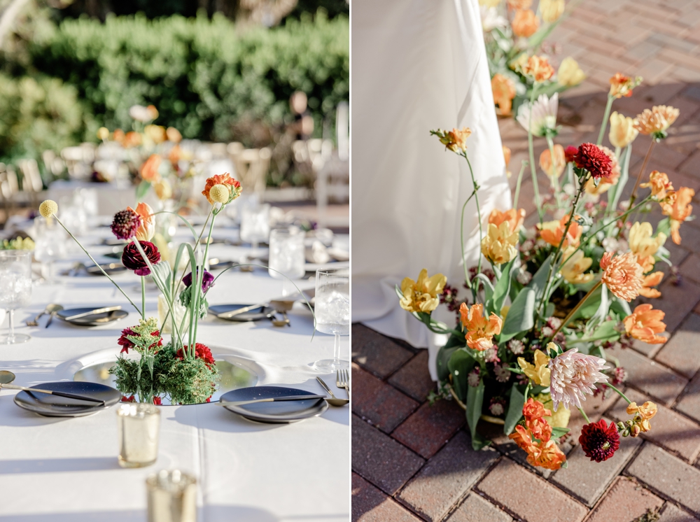 The bride’s impeccable style was on full display, with bright floral arrangements featuring pops of orange and red that perfectly complemented the lush garden surroundings. Each bouquet and centerpiece added a touch of vibrant beauty to the occasion.