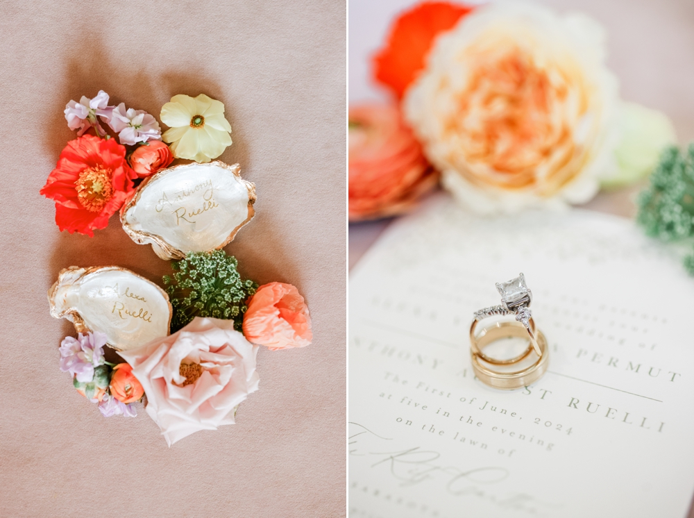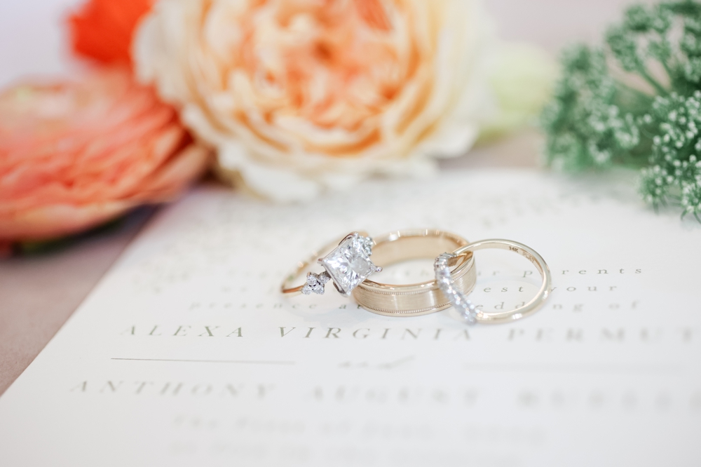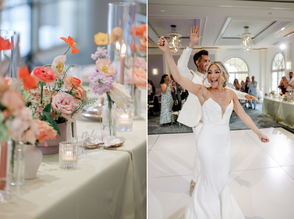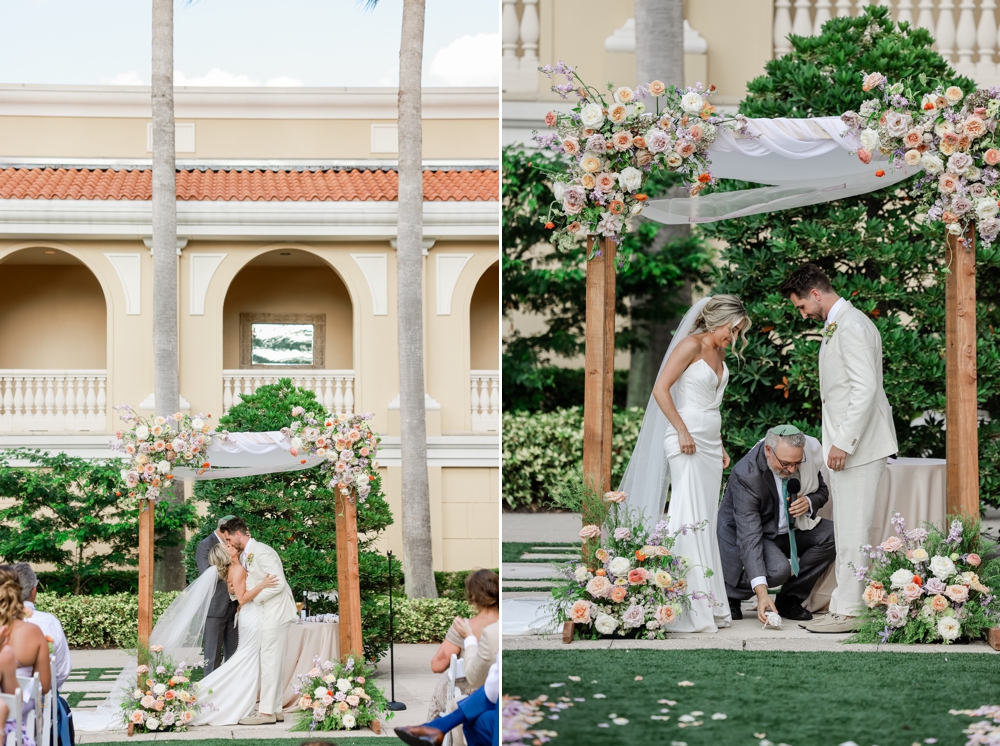 Their wedding ceremony honored their Jewish heritage, adding a deep layer of meaning to the day. Under a beautifully adorned chuppah, surrounded by family and friends, Anthony and Alexa exchanged vows in a heartfelt ceremony that blended tradition with their personal touch. The soft pinks and purples set a romantic tone, while vibrant orange blooms added a dynamic energy that mirrored their joyful spirits.