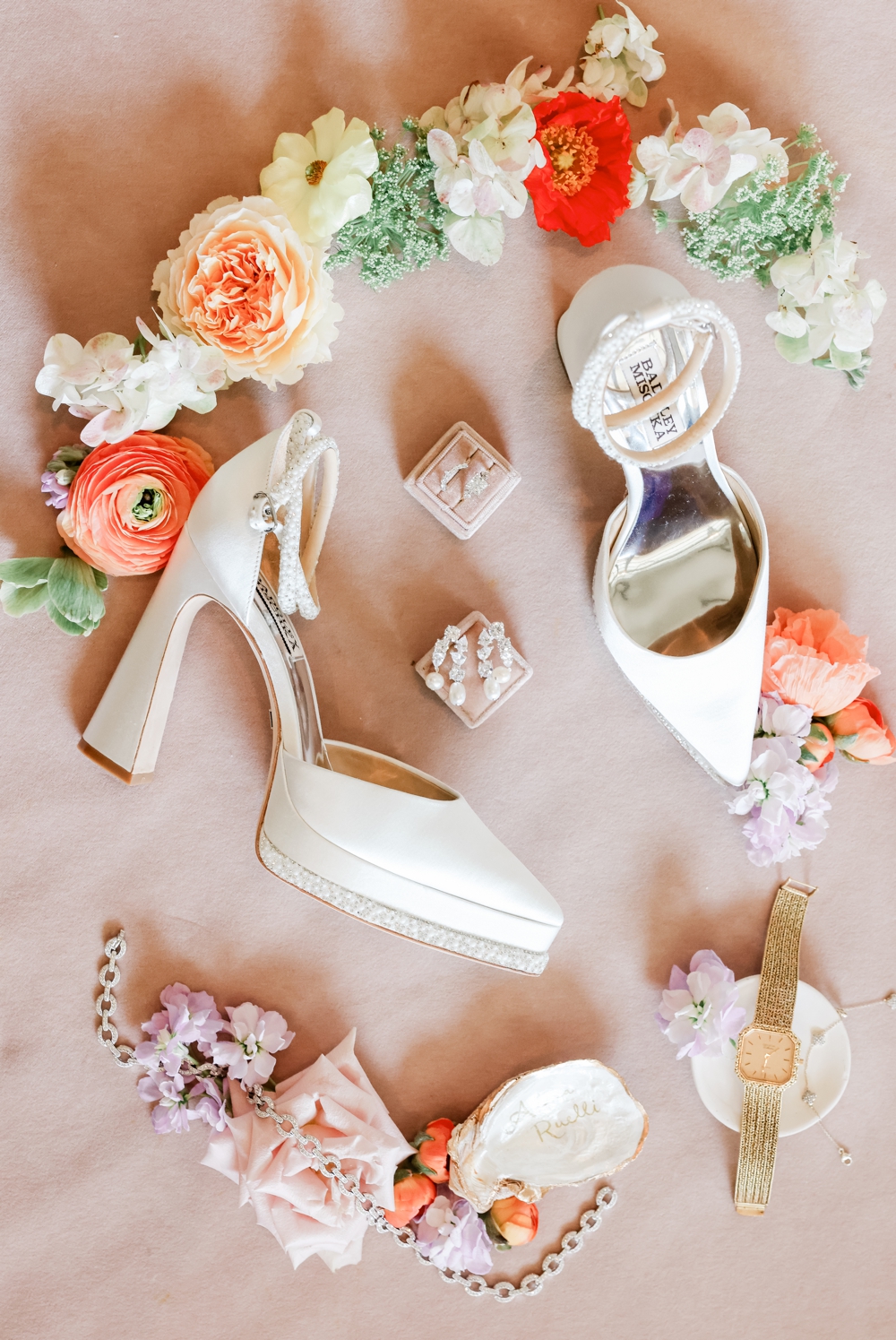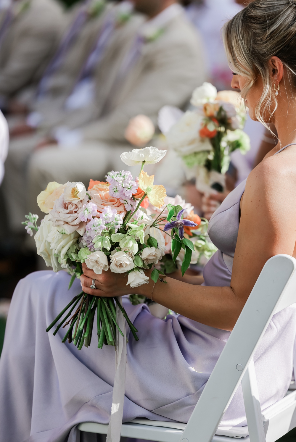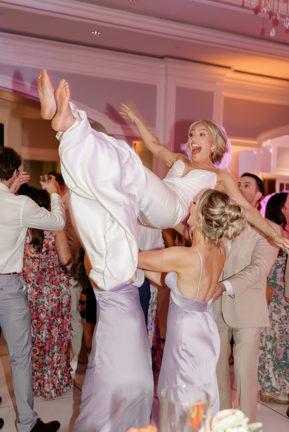 Their wedding ceremony honored their Jewish heritage, adding a deep layer of meaning to the day. Under a beautifully adorned chuppah, surrounded by family and friends, Anthony and Alexa exchanged vows in a heartfelt ceremony that blended tradition with their personal touch. The soft pinks and purples set a romantic tone, while vibrant orange blooms added a dynamic energy that mirrored their joyful spirits.