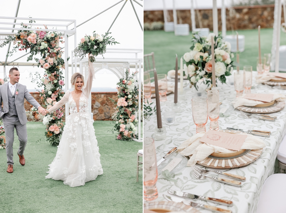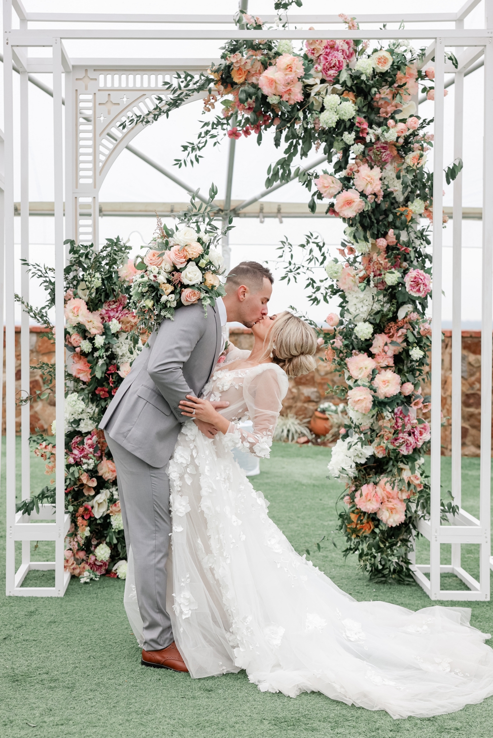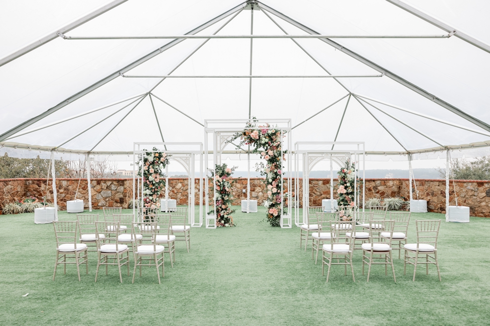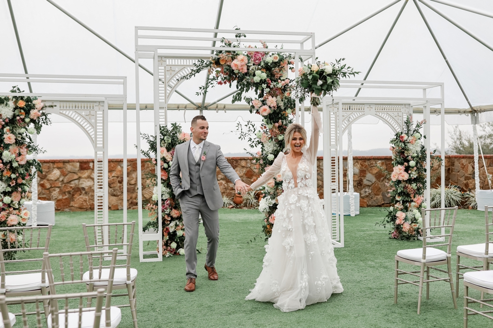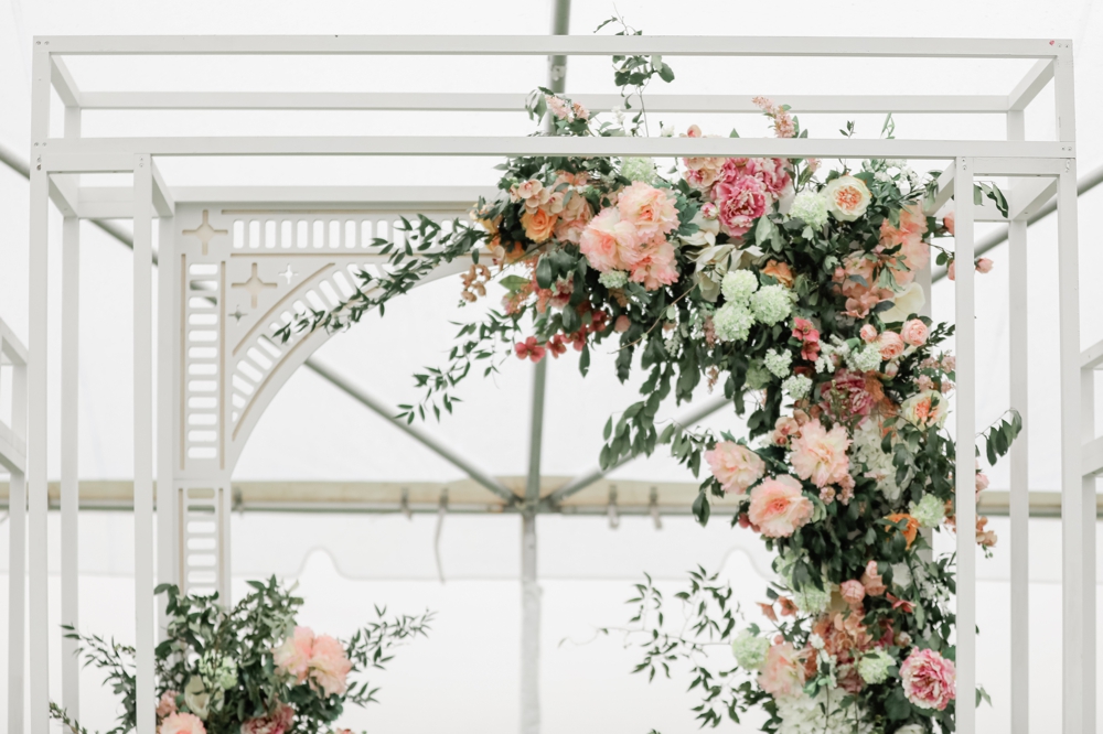 One of the standout features of the day was the incredible floral arrangements. Vibrant blooms in shades of pink complemented the natural greenery. The unique custom arch structure for the ceremony was adorned with these gorgeous flowers, creating an intimate space that framed their vows beautifully.